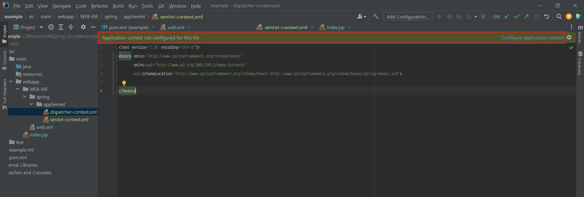 - servlet-context.xml 파일 생성하게 되면 아래와 같이 노란색 경고창이 뜨게 됨.
