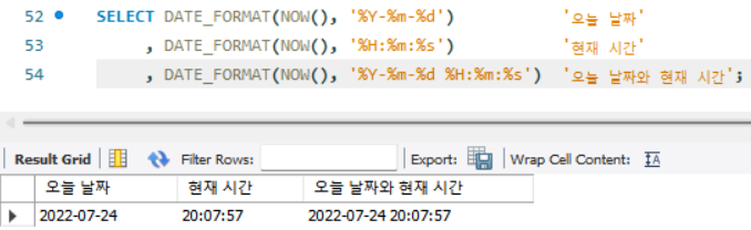 , DATE_FORMAT(NOW(), '%Y-%m-%d %H:%m:%s') AS 오늘 날짜와 현재 시간;