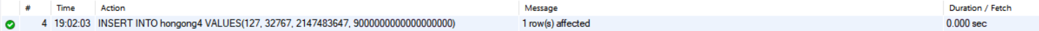 INSERT INTO hongong4 VALUES(127, 32767, 2147483647, 9000000000000000000);